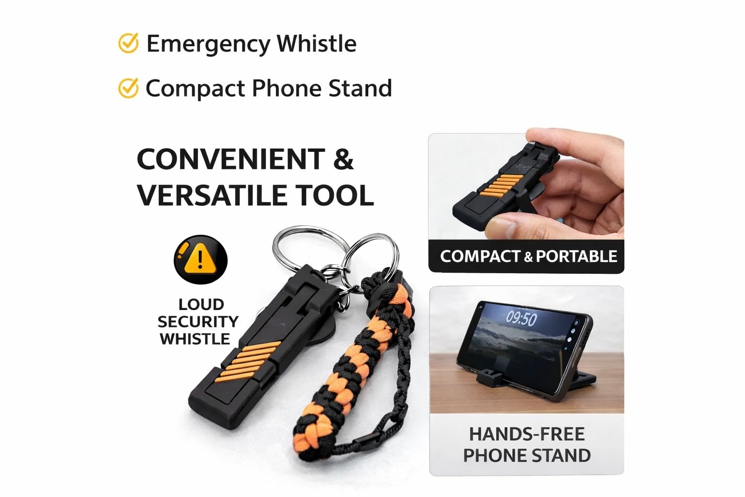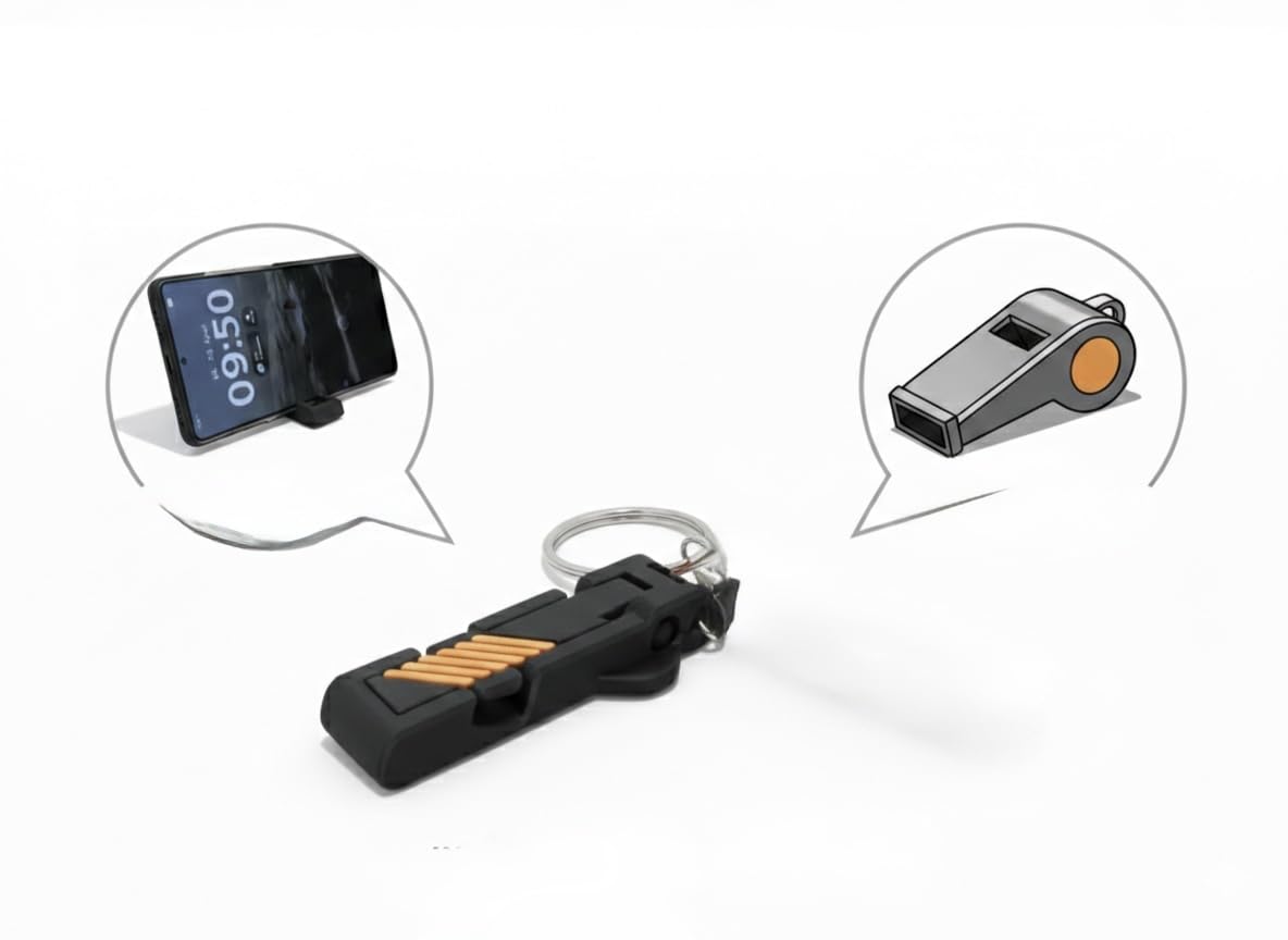 - PORTABLE AND LIGHTWEIGHT: Ultra-compact design easily attaches to keys, bags, or backpacks with the included keyring, ensuring you always have a phone stand and safety whistle readily available wherever you go
