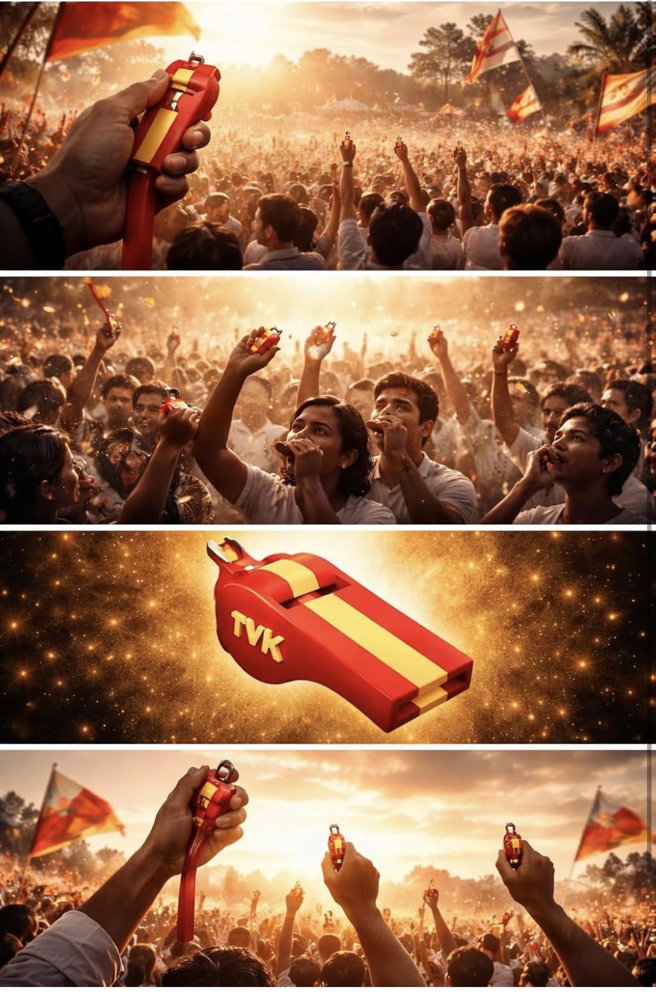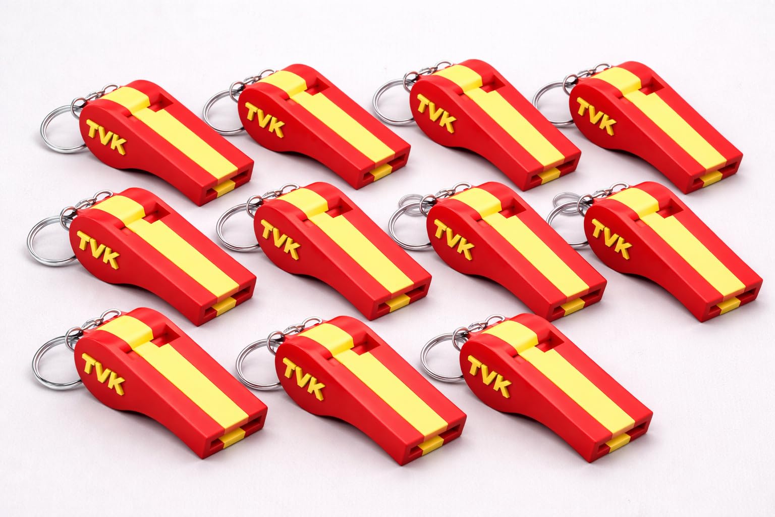- BOLD DESIGN: Eye-catching red and yellow TVK supporter whistle keychain with distinctive striped pattern and embossed branding for passionate fans