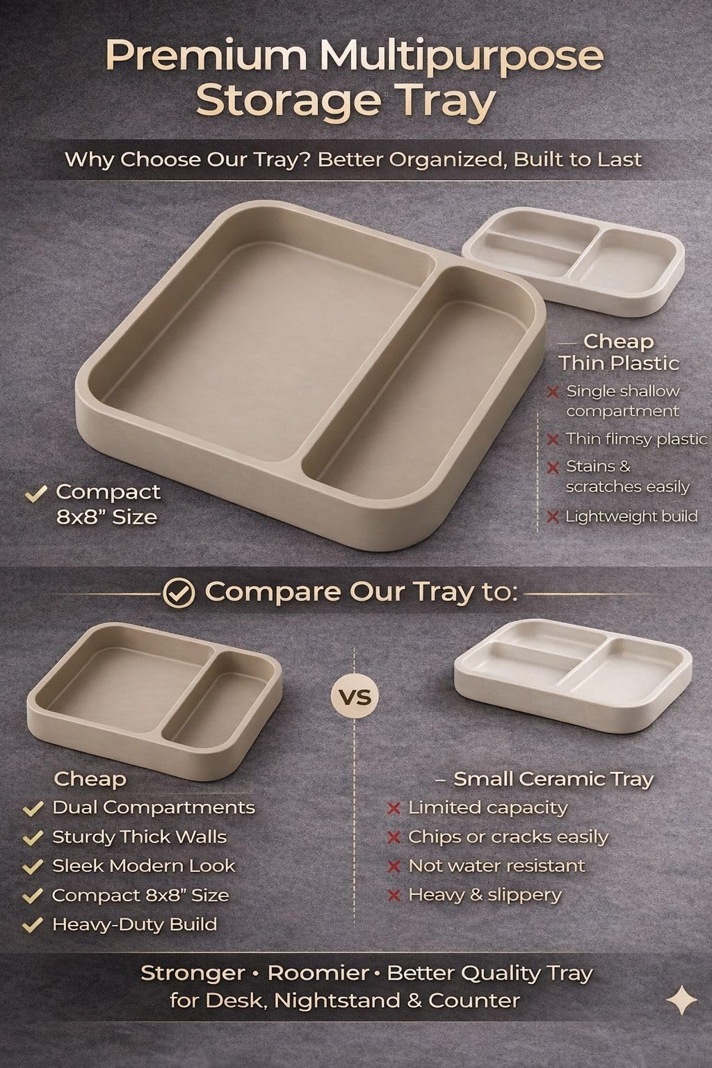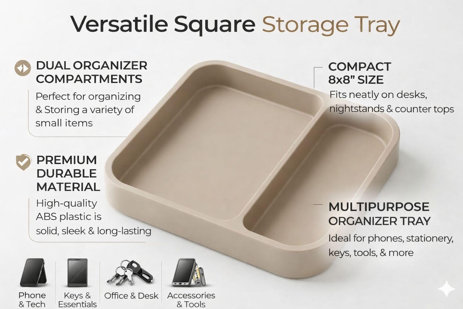 Modern 3D Printed Multipurpose Desk Organizer nd Desktop Storage Tray – Dual Section Organizer for Keys, Glasses, Jewellery & Small Items (Beige)