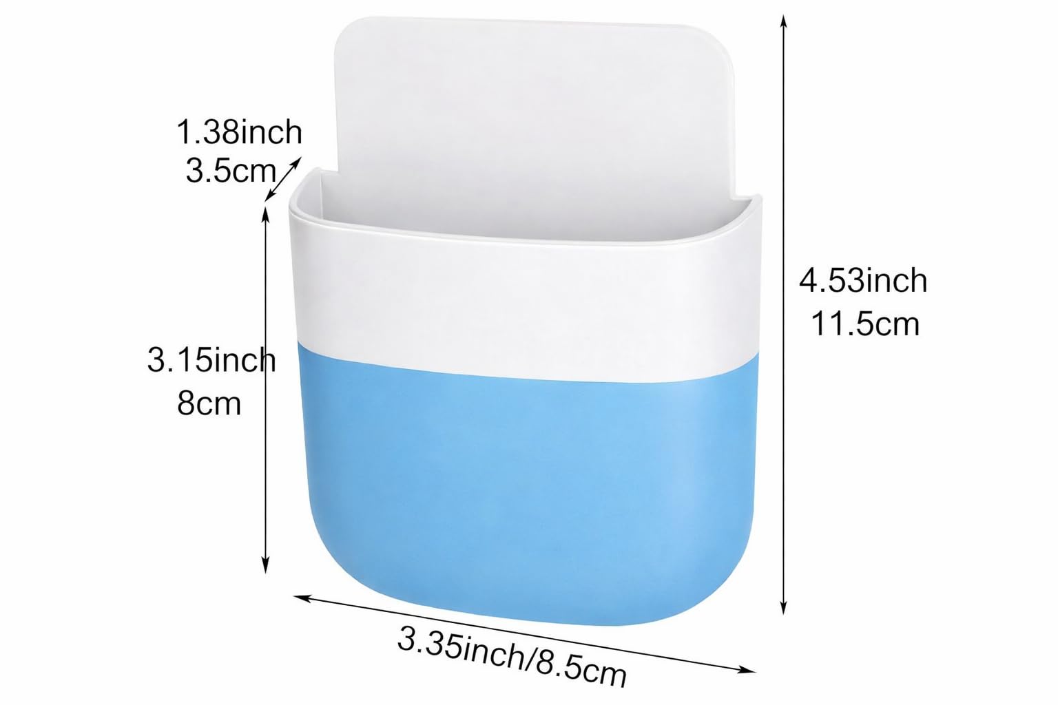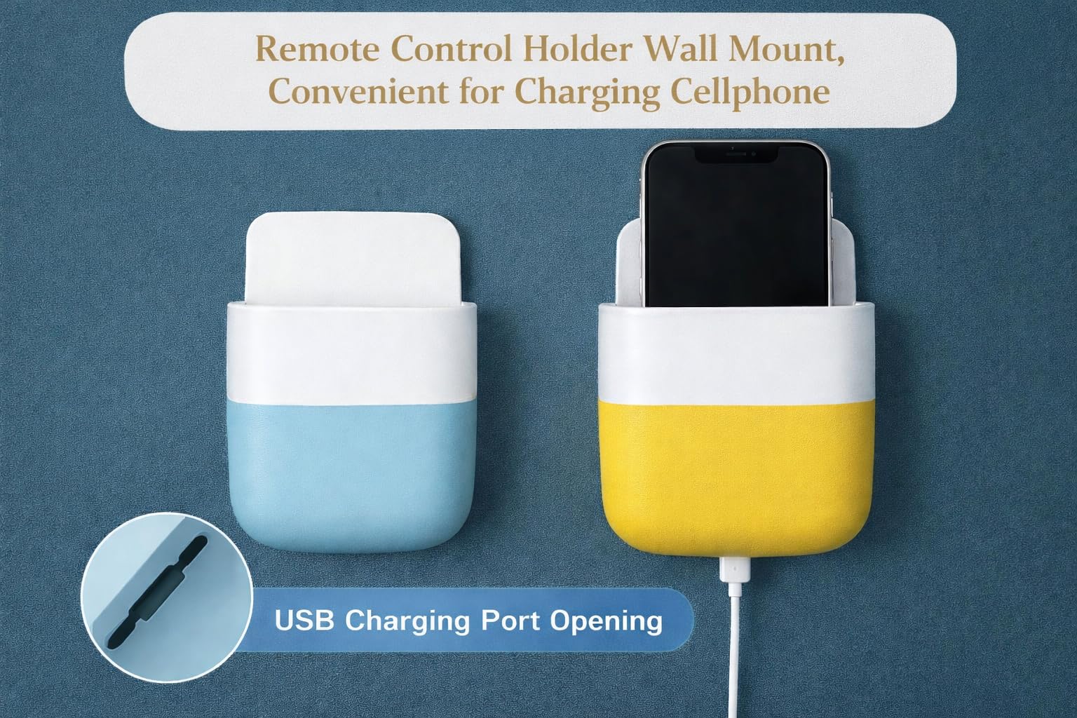 Wall Mount Storage Holder with USB Charging Port, Adhesive Organizer for Mobile Phone, Remote Control, White and Blue